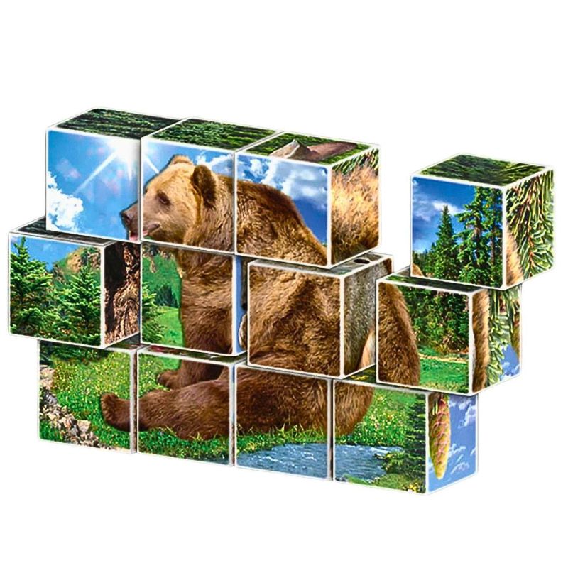 Кубчета като на пъзел могат да се наредят 6 различни картинки на горски животни. Комплектът развива въображението, наблюдателността и съобразителността при децата.