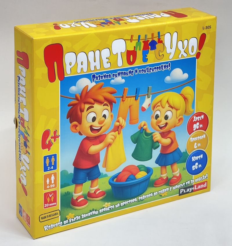 В тази игра участниците ще се състезават кой най-бързо ще подреди дрехите на простора си по вид, цвят и място, в съответствие с подредбата им на картите. С лесни и бързи за научаване правила, „Прането е сухо!“ подпомага развитието на бързи реакции, концентрация и координация между ръцете и очите. Играта е предназначена за деца над 4 години, като могат да участват 1-4 играчи.