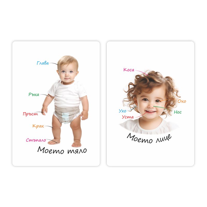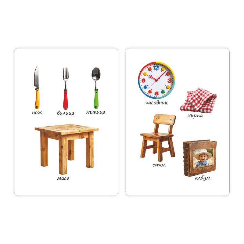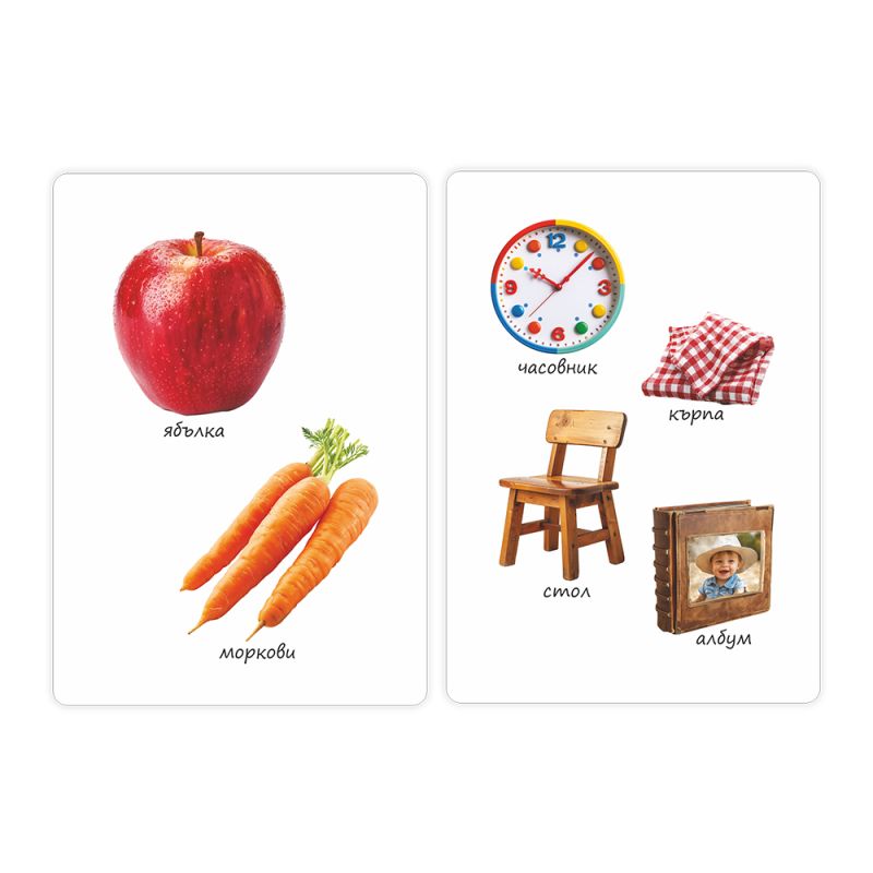 Картите са с ярки реалистични изображения, което стимулира визуалната памет и подпомага ранното езиково развитие. Подходящи са за съвместна игра с родителите и за стимулиране на речта чрез повтаряне, назоваване и съставяне на изречения.