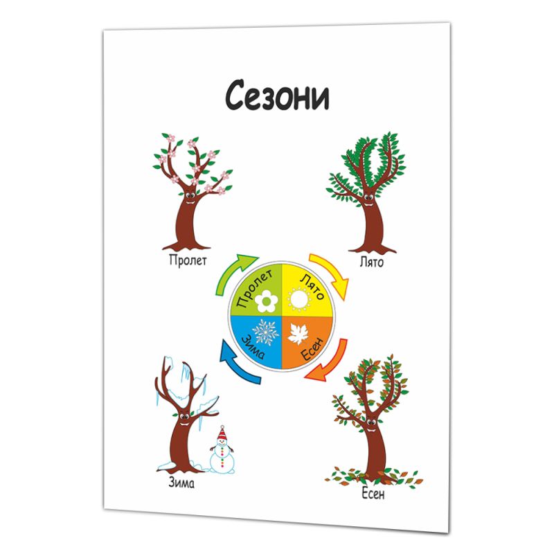 Идеално за децата, които желаят да научат повече за четирите големи сезона - пролет, лято, есен и зима. С тази табла, децата ще научат основните характеристики на всеки една сезона, като температурните изменения, типовете растения и животни, които живеят в тези сезони, и какви дейности са подходящи за всеки сезон.
