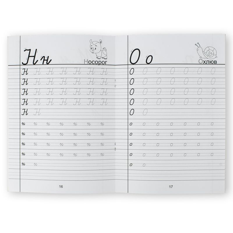 Всяка следваща страница съдържа буква от азбуката (малка и голяма) в ръкописен вариант, която трябва да бъде многократно повторена с помощта на контури. В горния десен ъгъл на страниците е поставена дума, която отговаря на дадената буква придружена с малка рисунка.